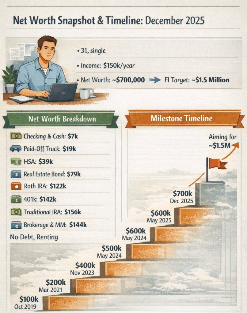 As of December 2025, my net worth is about $700,000. I make roughly $150k per year, and my loose target for financial independence is around $1.5M (give or take).